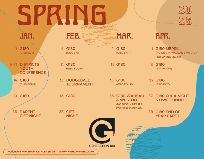 Wednesday Night Generation180 (G180) meets on Wednesday nights at our Wausau Campus from 6-7:45pm, Weston Campus 6-7:30pm, and our Merrill Campus 6-7:45pm. Midweek gatherings take place from September through May. Each week includes plenty of hanging out, food, worship, prayer, Bible lesson, and a time for small groups that we call Life Groups.